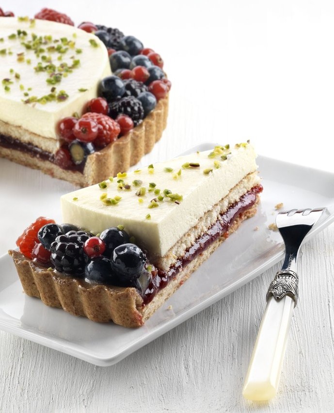 z musem z mascarpone, leśnymi owocami i kruszonymi pistacjami
